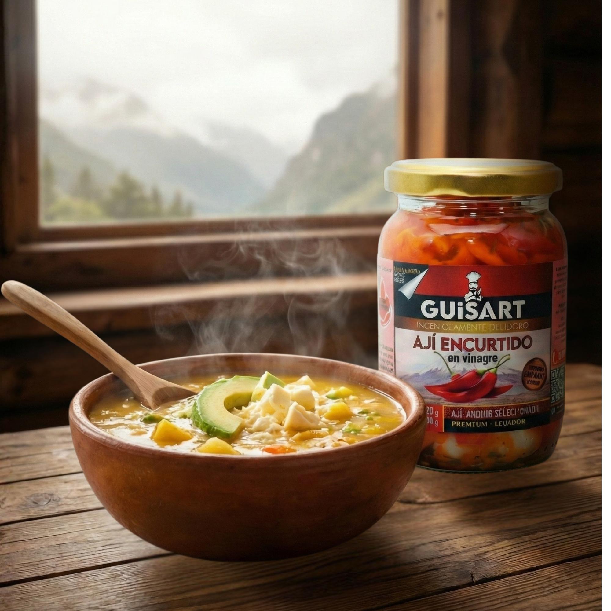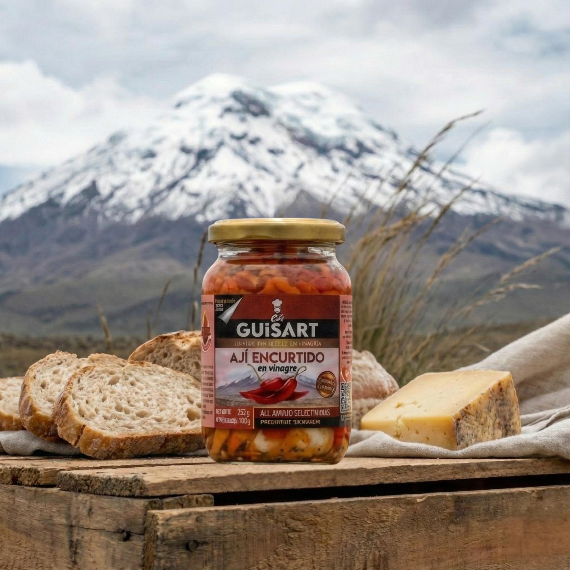 La mayoría de ajíes encurtidos comerciales son pedazos de ajíes blandos, sin sabor y sin ninguna diferenciación. Nuestro Ají encurtido en vinagre Guisart es macerado con ajo y especias seleccionadas, es nuestro producto emblemático, con mucho sabor y textura. Es elaborado con ají andino, cuidadosamente cuidado y seleccionado hasta llegar a su mesa, cumpliendo rigorosos procesos de elaboración y fabricación.